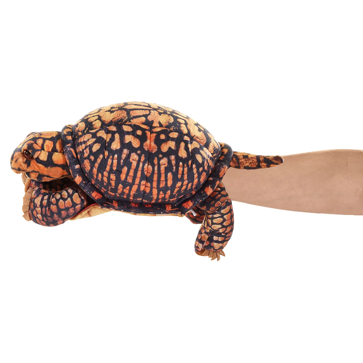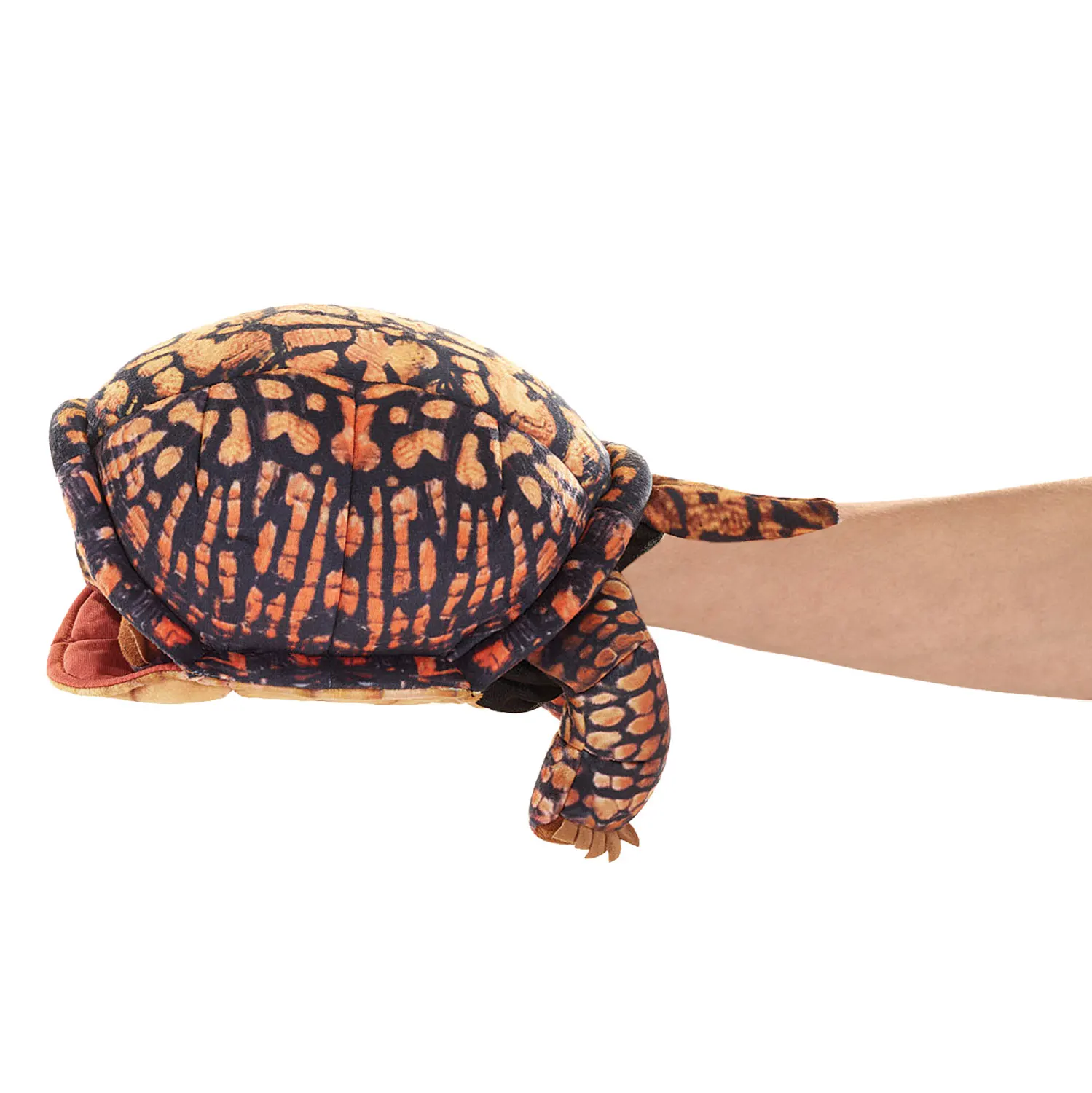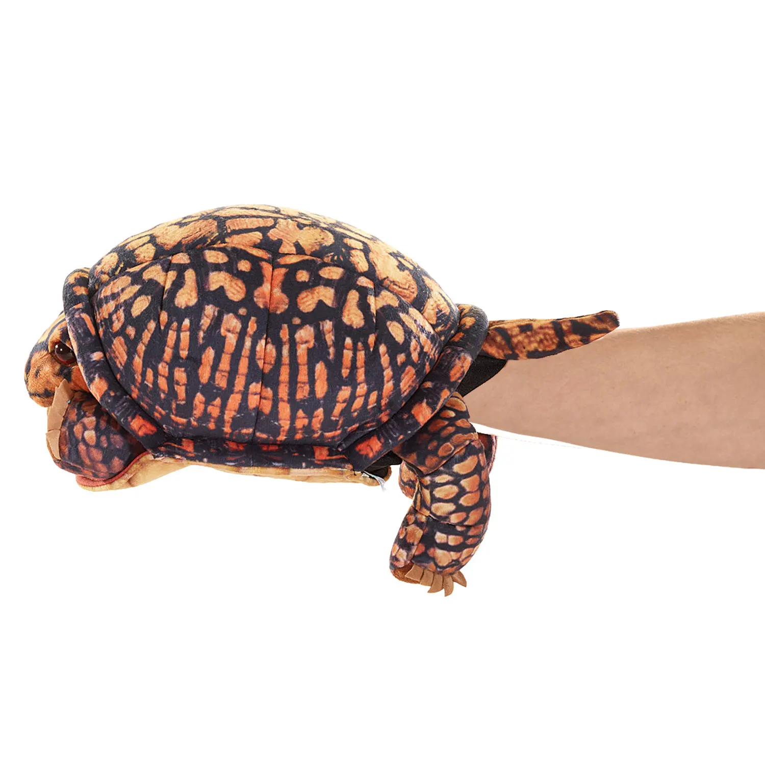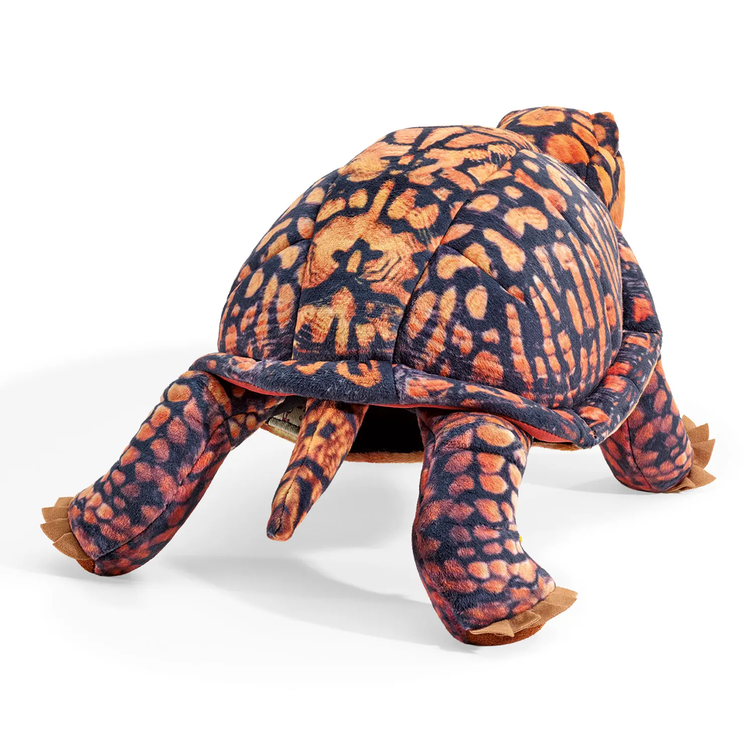 Diese kunstvoll gestaltete Schildkröte wirkt authentisch durch ihre natürlichen Ocker- und Kastanienfarben mit stammesartigen Mustern auf speziellem Samtstoff. Erzählen Sie spannende Geschichten mit beweglichem Maul und Vorderbeinen und ziehen Sie Kopf und Vorderbeine ins Panzerinnere zurück, wenn es Zeit zum Ausruhen ist.