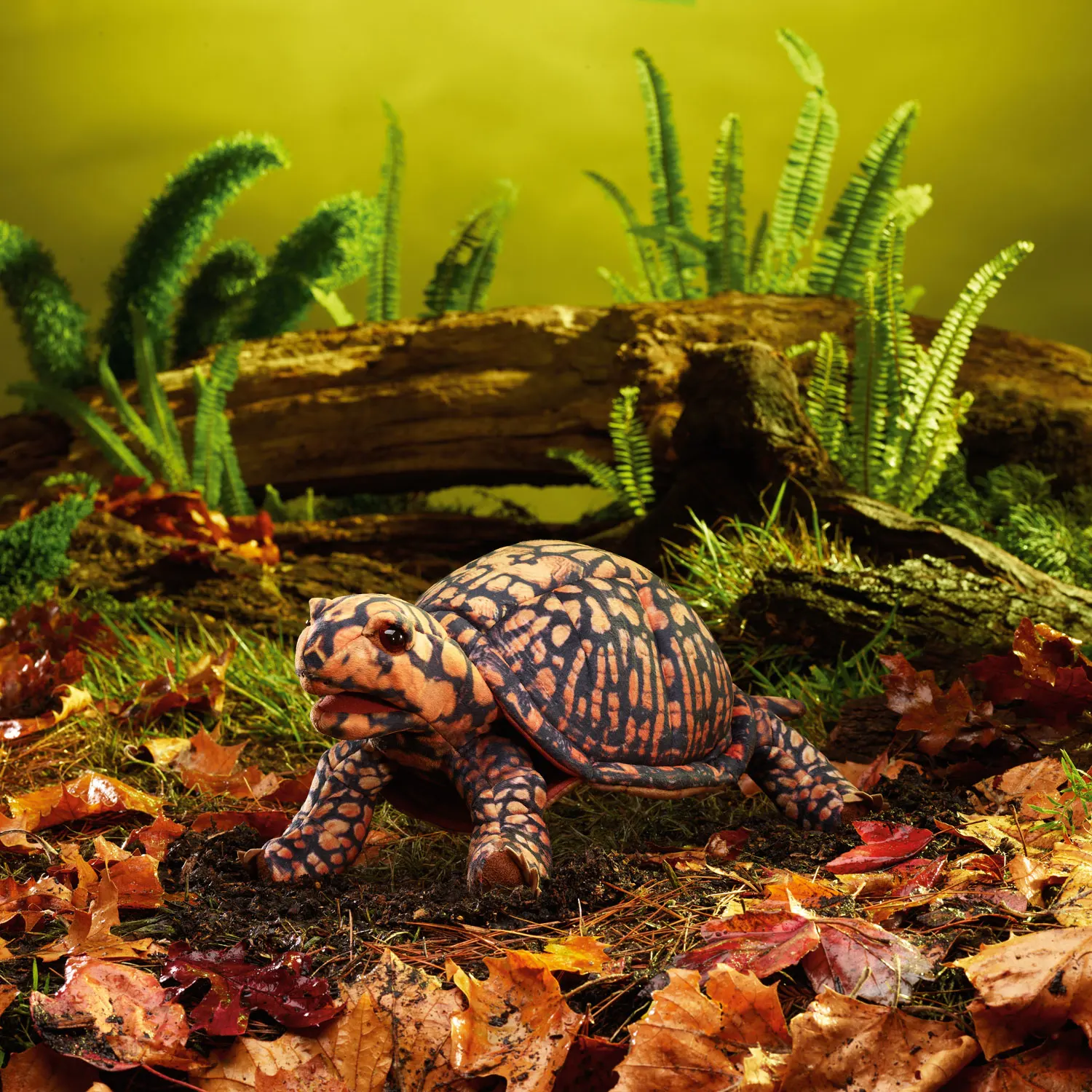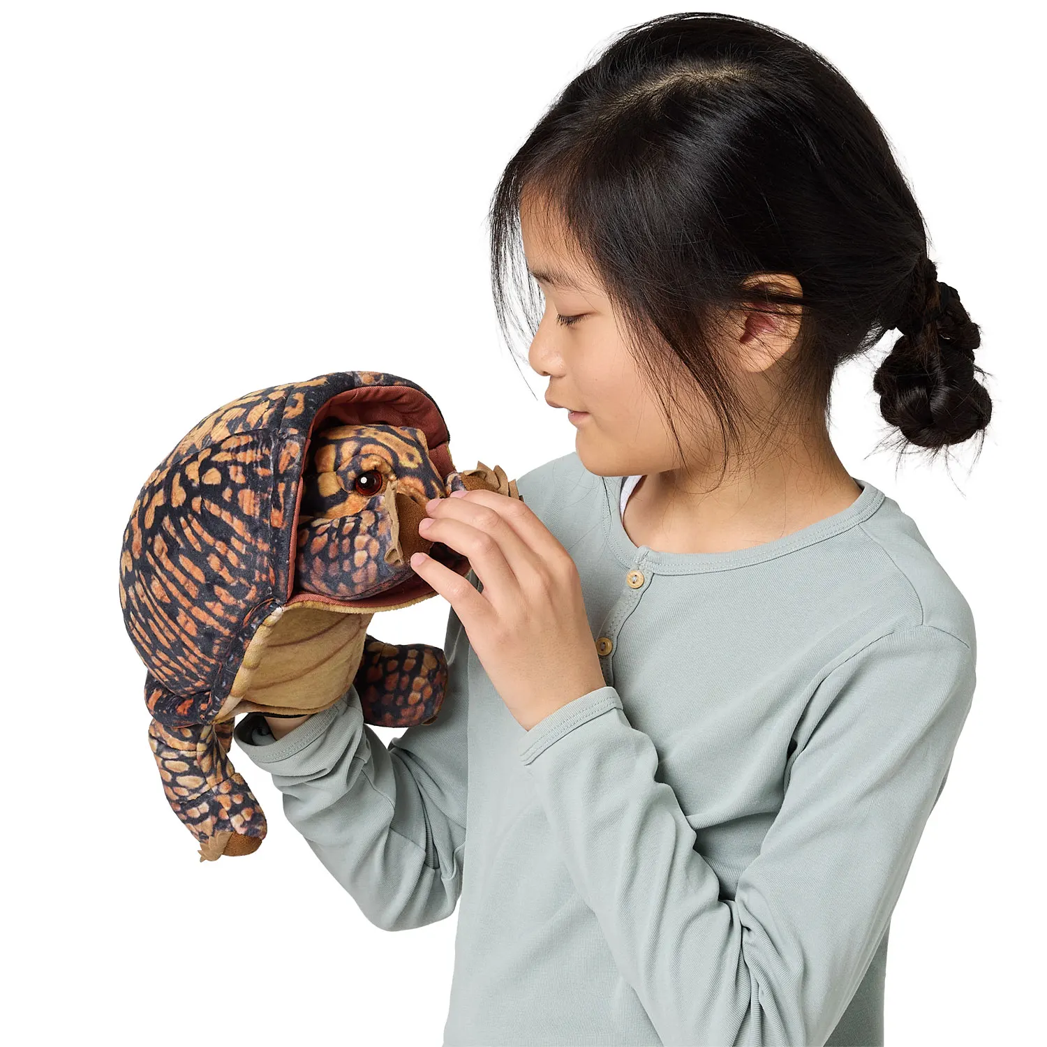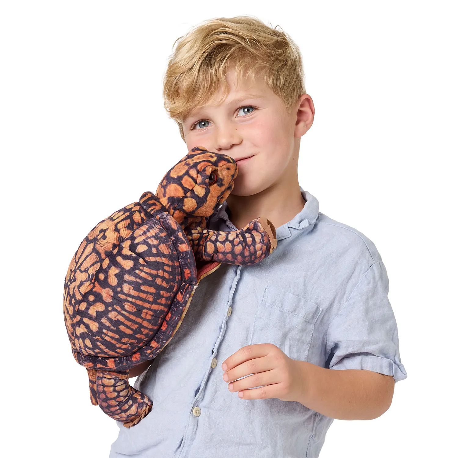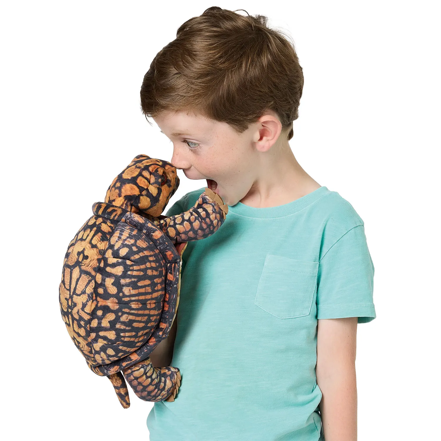 Diese kunstvoll gestaltete Schildkröte wirkt authentisch durch ihre natürlichen Ocker- und Kastanienfarben mit stammesartigen Mustern auf speziellem Samtstoff. Erzählen Sie spannende Geschichten mit beweglichem Maul und Vorderbeinen und ziehen Sie Kopf und Vorderbeine ins Panzerinnere zurück, wenn es Zeit zum Ausruhen ist.