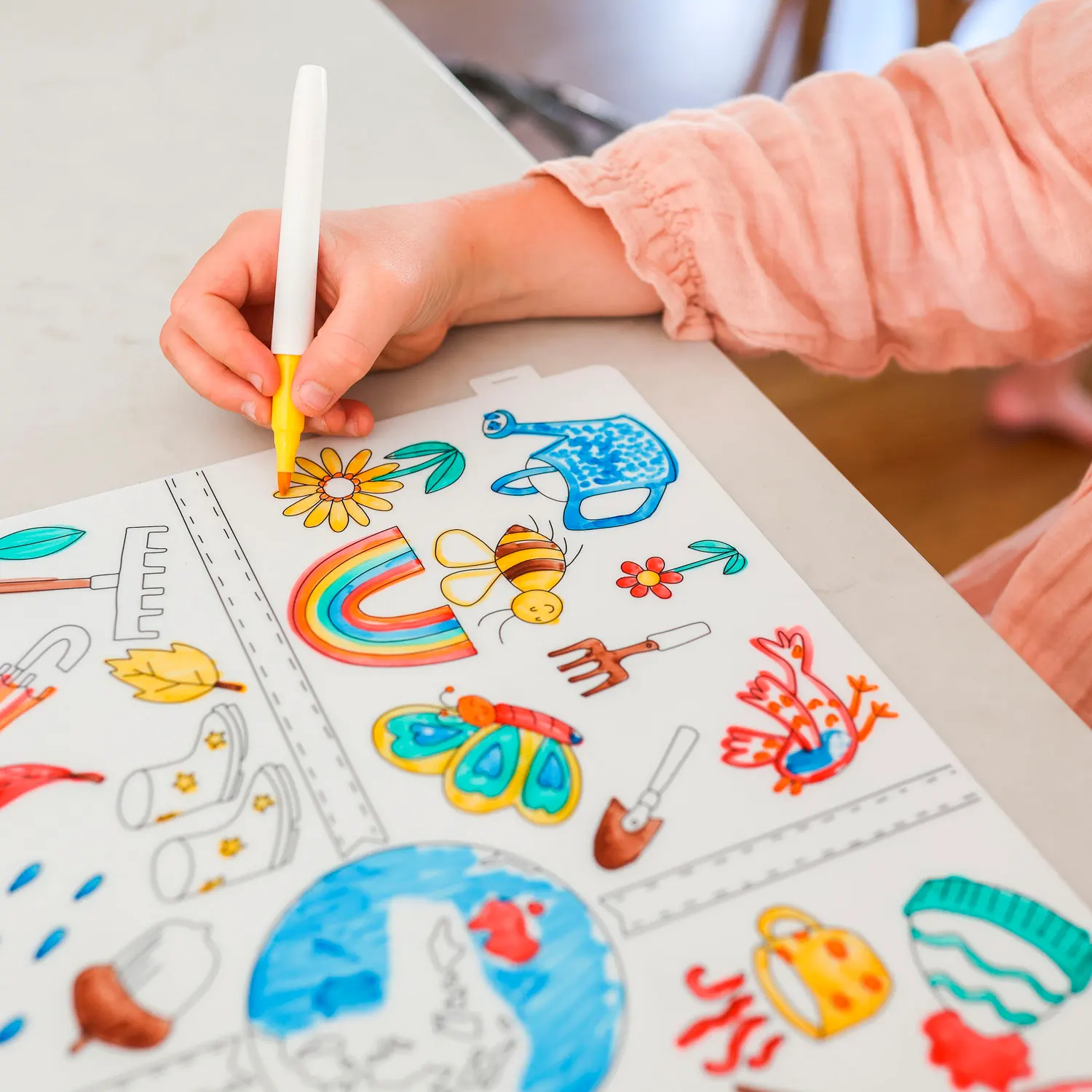 Die wiederverwendbare Silikonmatte mit den „non-permanent-Farbstiften" eröffnen dir eine Welt voller kreativer Möglichkeiten: Malen, wegwischen, neu anfangen – so oft du willst. Die Rückseite ist ohne Motive für freies Zeichnen und Ausmalen.