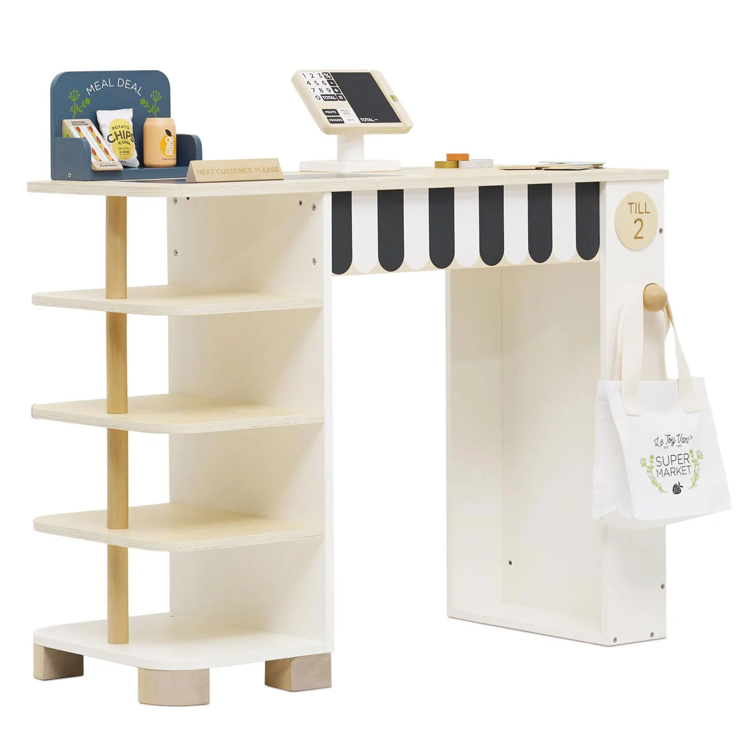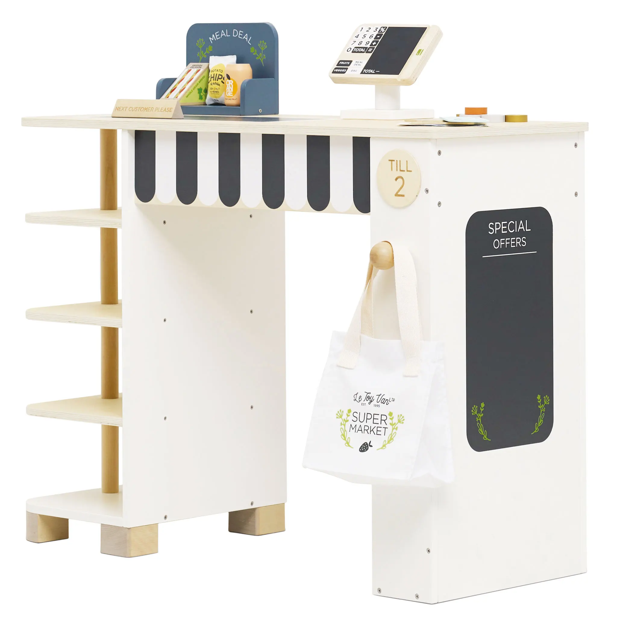 Um das Erlebnis noch spannender zu machen, gibt es außerdem eine schicke Kreidetafel-Kasse, Förderband, Scanner, Spielgeld, nächster Kunde-Schild, Kreidetafel mit Sonderangeboten, Baumwolltasche, Zahlungs-, Belohnungs- und Treuekarten.