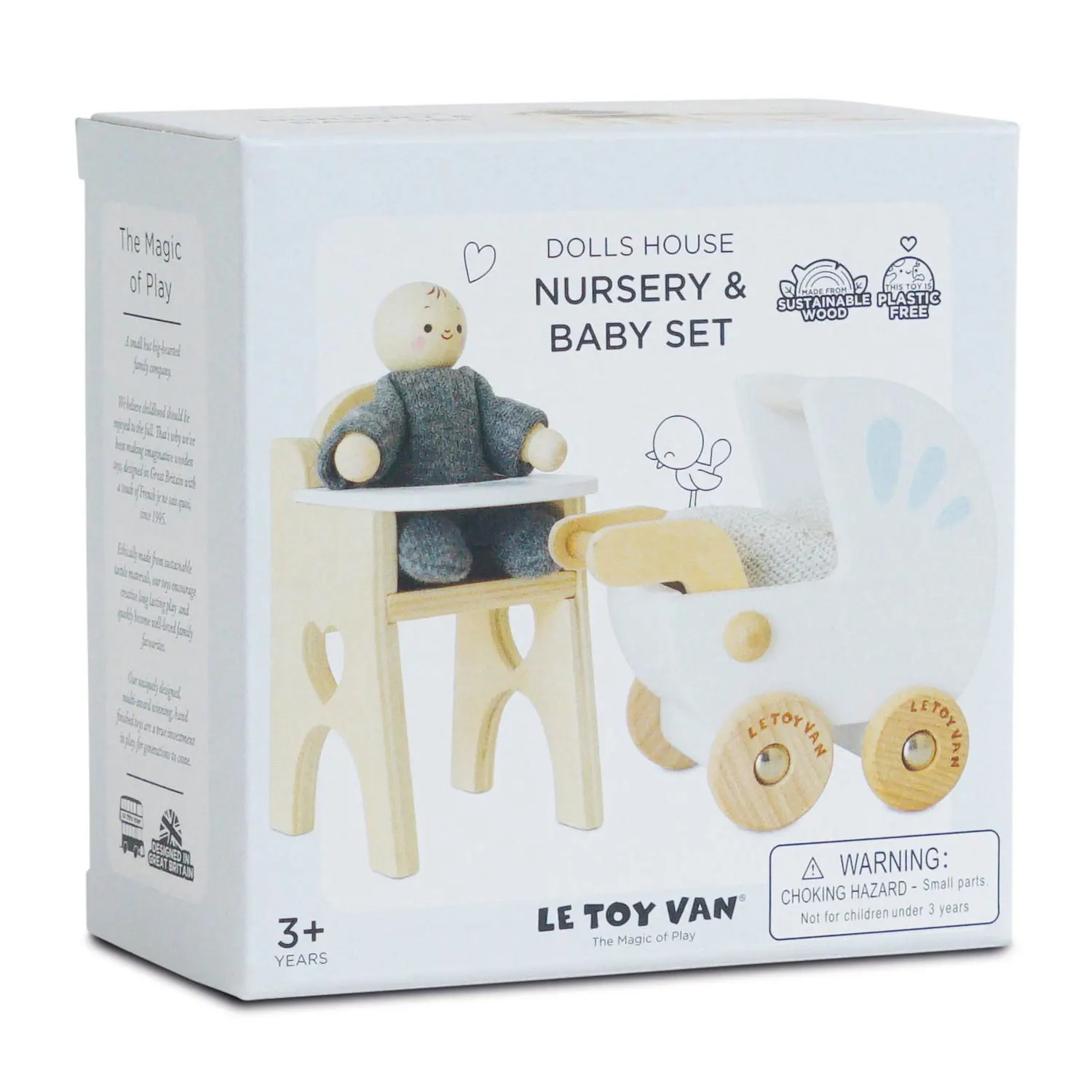 Das entzückende Kinderpuppenhaus-Möbelset enthält ein bewegliches Holzbaby, einen Buggy und einen Hochstuhl. Ideal für alle Le Toy Van Puppenhäuser.