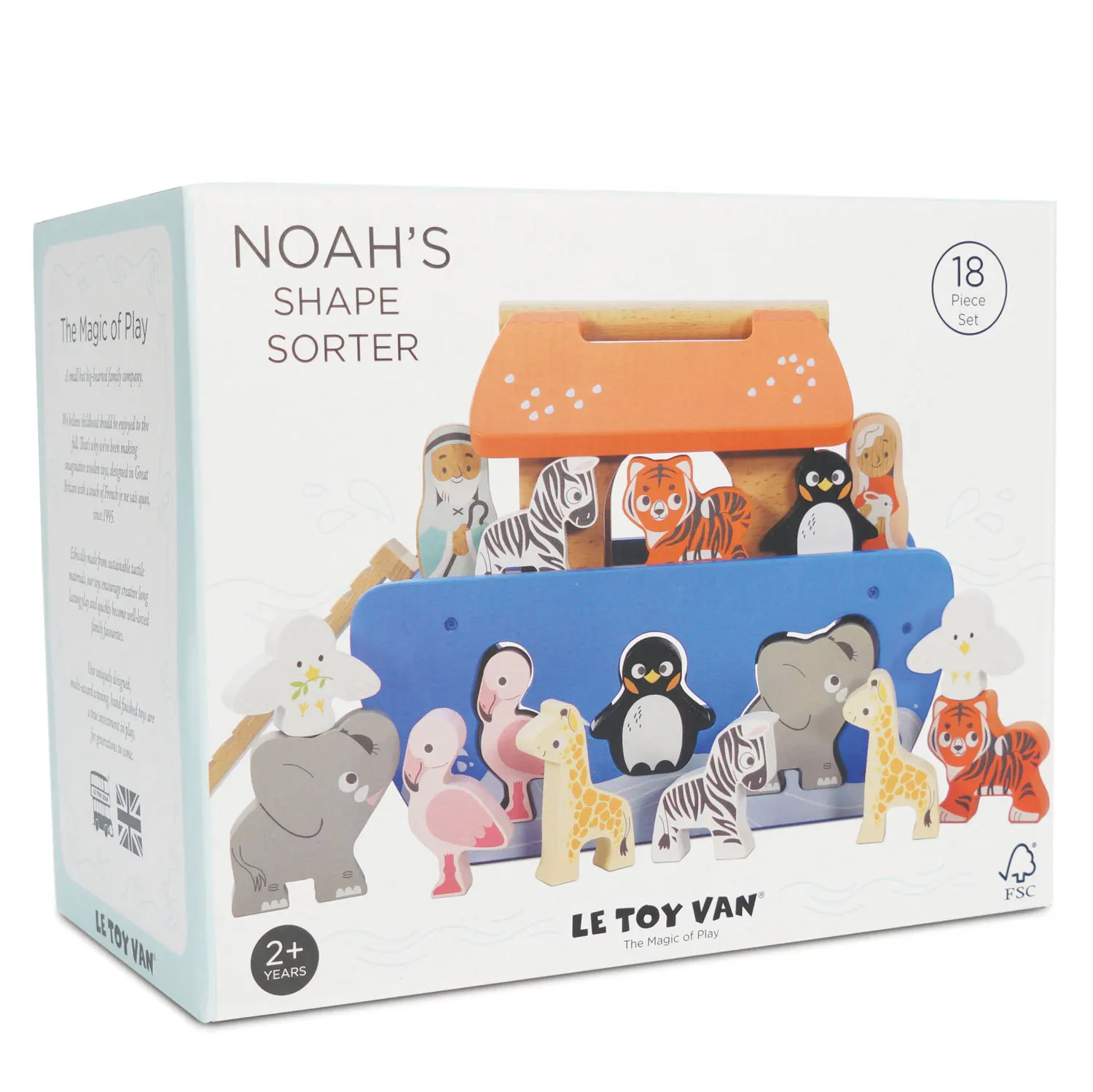 Diese bunt bemalte Arche macht doppelt so viel Spaß! Sie enthält 6 Paare von niedlichen Holztieren. Mit Hilfe ihrer hölzernen Freunde können Kleinkinder ihre sensorischen, motorischen und koordinativen Fähigkeiten entwickeln, indem sie die Formen in die entsprechenden Löcher stecken. Dieses clevere Spielzeug verfügt über einen praktischen Tragegriff und kann auch für fantasievolle Spiele verwendet werden. Es gibt eine Leiter zu entdecken und eine Schiebetür, durch die die Tiere ein- und aussteigen können. Dieses Formensortierspielzeug ist aus FSC®-zertifiziertem Holz (Holz aus nachhaltig bewirtschafteten Wäldern) hergestellt und mit kindersicheren Farben auf Wasserbasis bemalt.