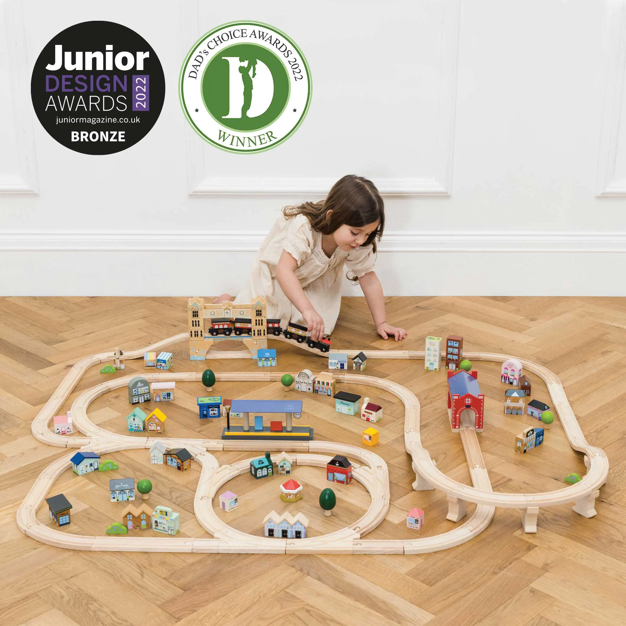 Dieses 120-teilige Holzeisenbahn-Set verfügt über detaillierte Kunstwerke, die das Spiel zu einer Entdeckungsreise machen. Schauen Sie im Schönheitssalon, in der Zoohandlung oder sogar in der Pizzeria vorbei!