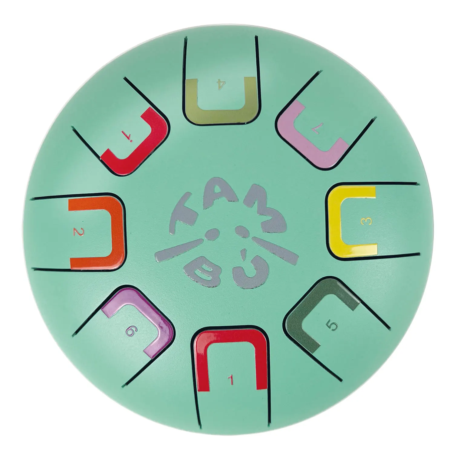 TAMBÚ is a fascinating musical instrument that is ideal for beginners in the world of percussion. The 8-inch steel tongue drum can be played in different ways. When played with the hands, it produces a soft sound. Played with the fingers directly or with the fingerpicks attached, other timbres are produced. By using the drumsticks, the sound produces an echo that is more penetrating, powerful and ethereal. In addition to the possibility of free playing, numbers and colours are painted on the body to correspond with an accompanying songbook and guide the player. The TAMBÚ has 11 notes and is tuned in G major. Contains: - 2 drumsticks - Attachable finger picks. - Sheet music with colour symbols for simple children's songs. - An attractive carrying case, for gentle transport. Also ideal for relaxation and yoga sessions.