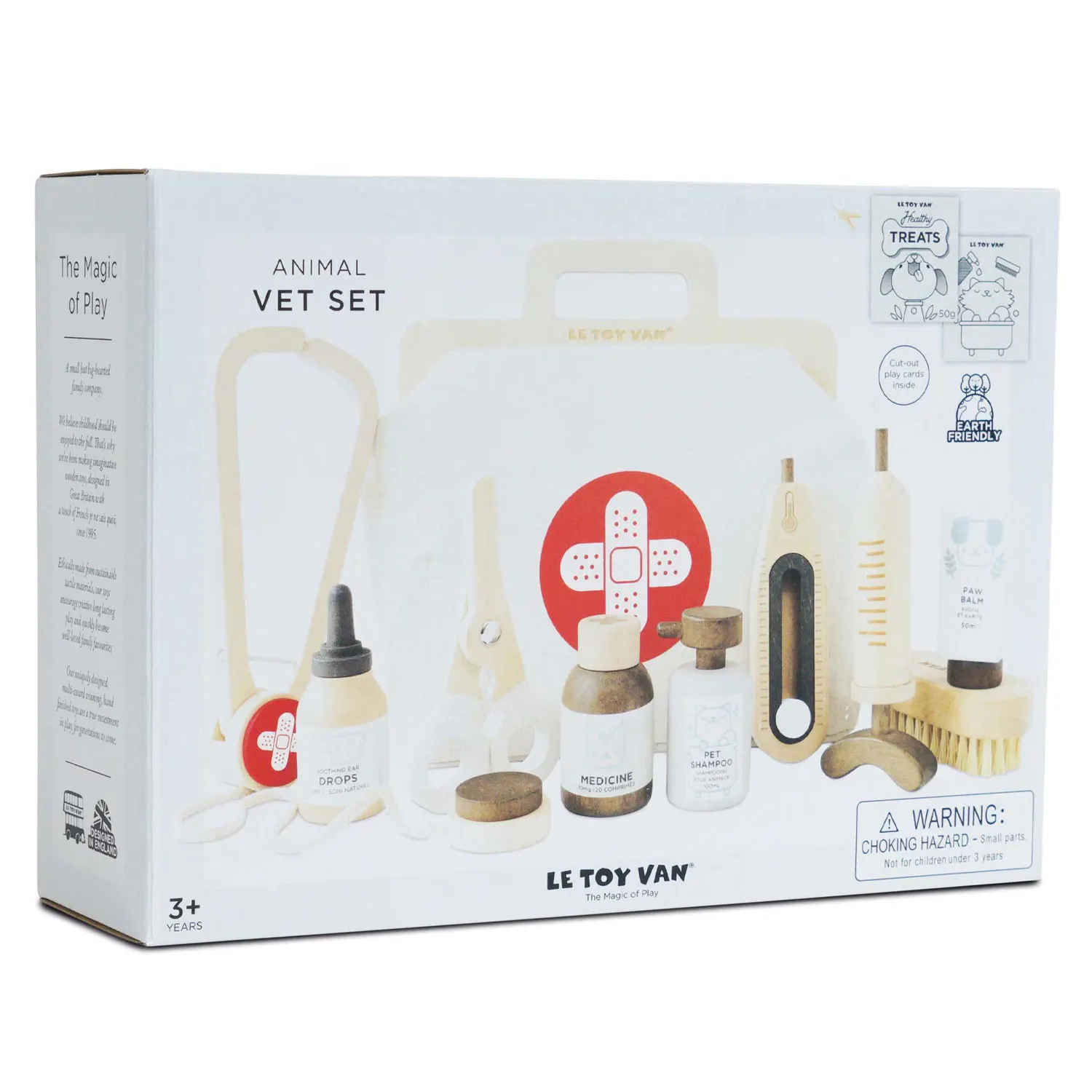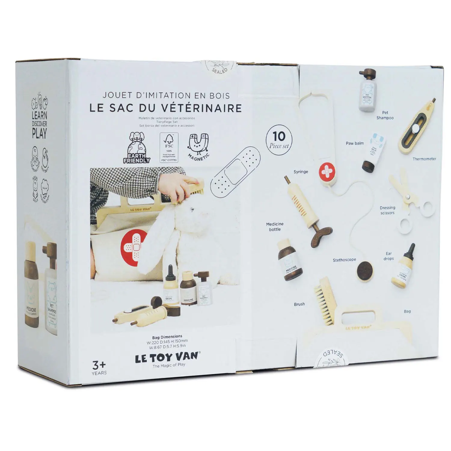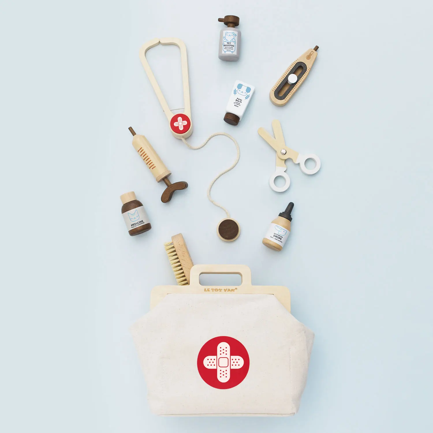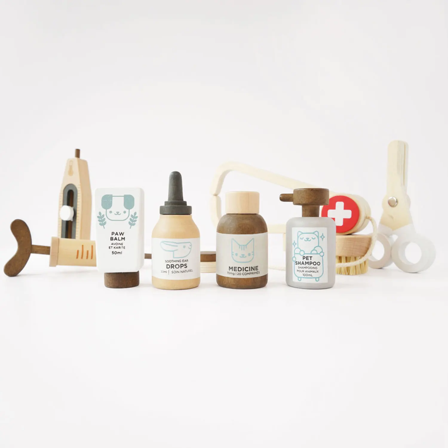 Enthalten sind: beruhigender Balsam für die Pfoten, Ohrentropfen, Medizinflasche, Shampoo für Haustiere, Stethoskop, eine Verbandsschere, eine Injektionsspritze und eine weiche Öko-Borstenbürste.