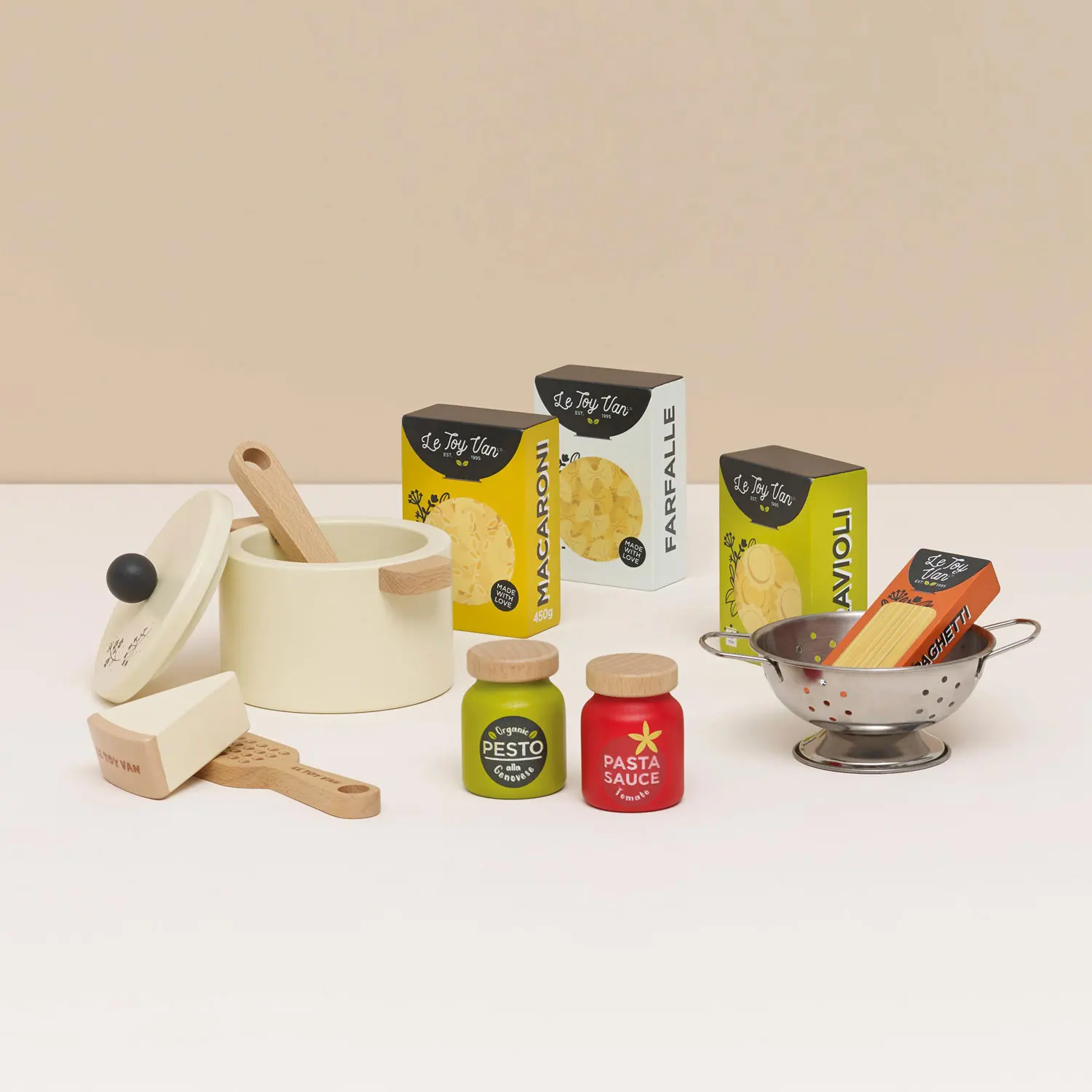 Dieses Set enthält die wichtigsten Utensilien, um das perfekte italienische Gericht zu kochen, darunter ein Kochtopf, ein Metallsieb, eine Käsereibe und ein Holzlöffel - für köstliche Pasta-Kreationen!