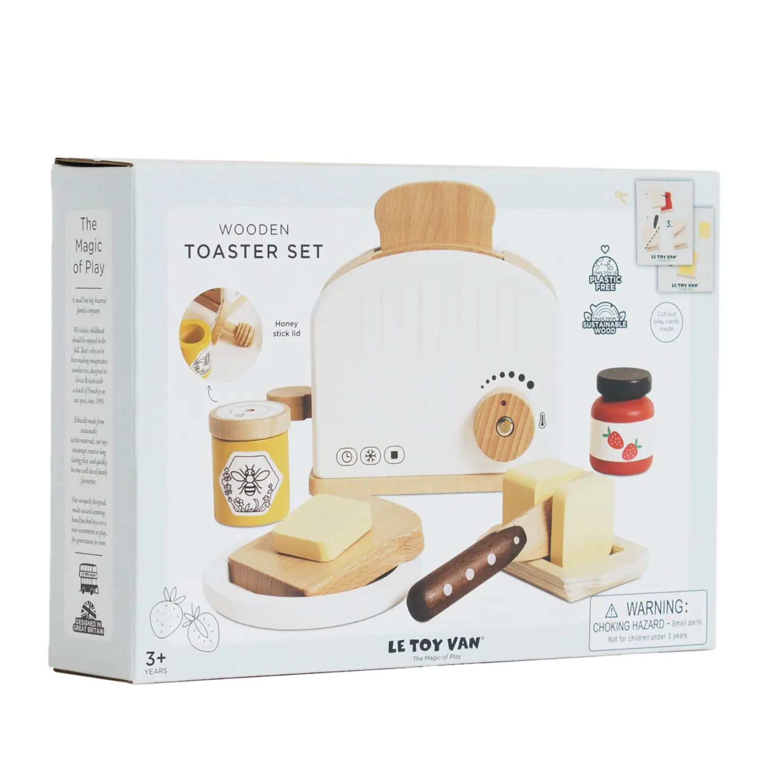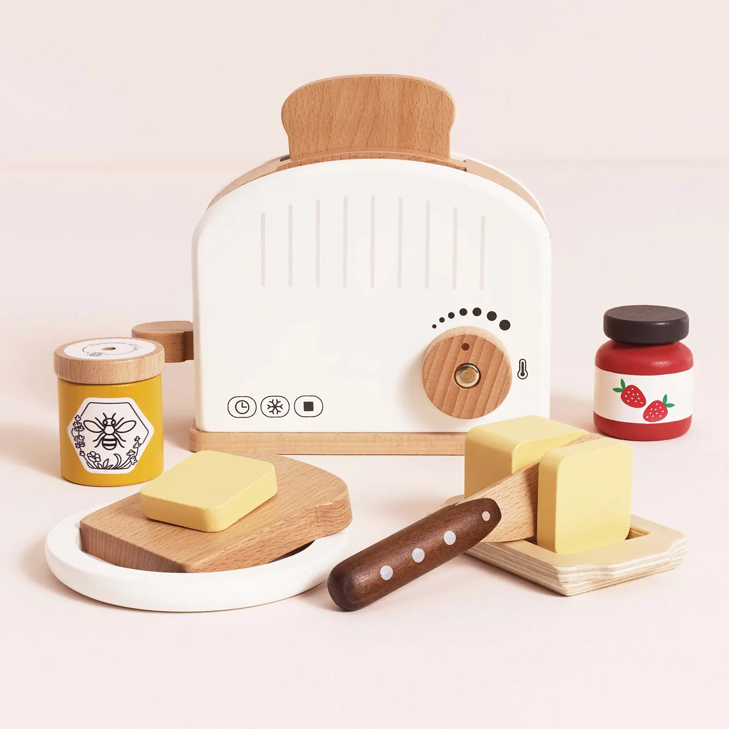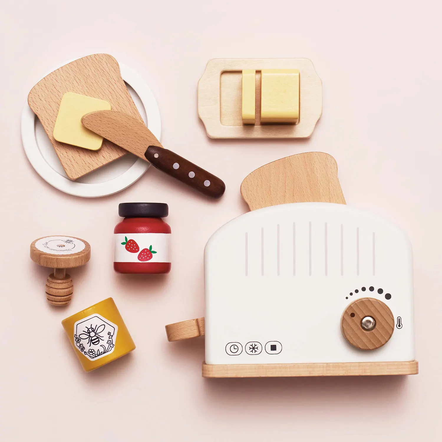 Es umfasst einen klassischen Pop-up-Toaster mit Temperaturregler und zwei Toastscheiben, perfekt für ein spielerisches Frühstück.