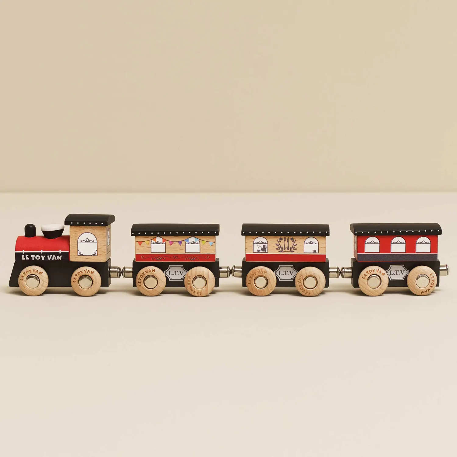 Die Waggons sind handgefertigt aus massivem, nachhaltigem Gummibaumholz mit magnetischen Teilen, damit Kinder den Zug zusammenbauen, mitnehmen und auseinandernehmen können.