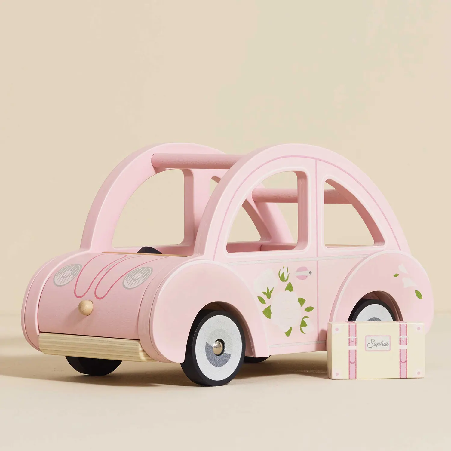 Auf ins Abenteuer – mit diesem Retro-Holzauto im charmanten Pastellrosa.