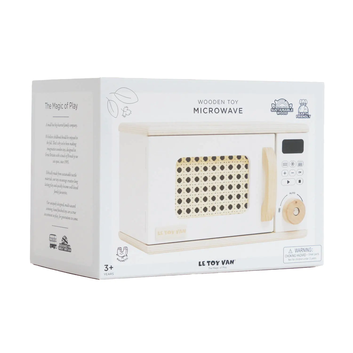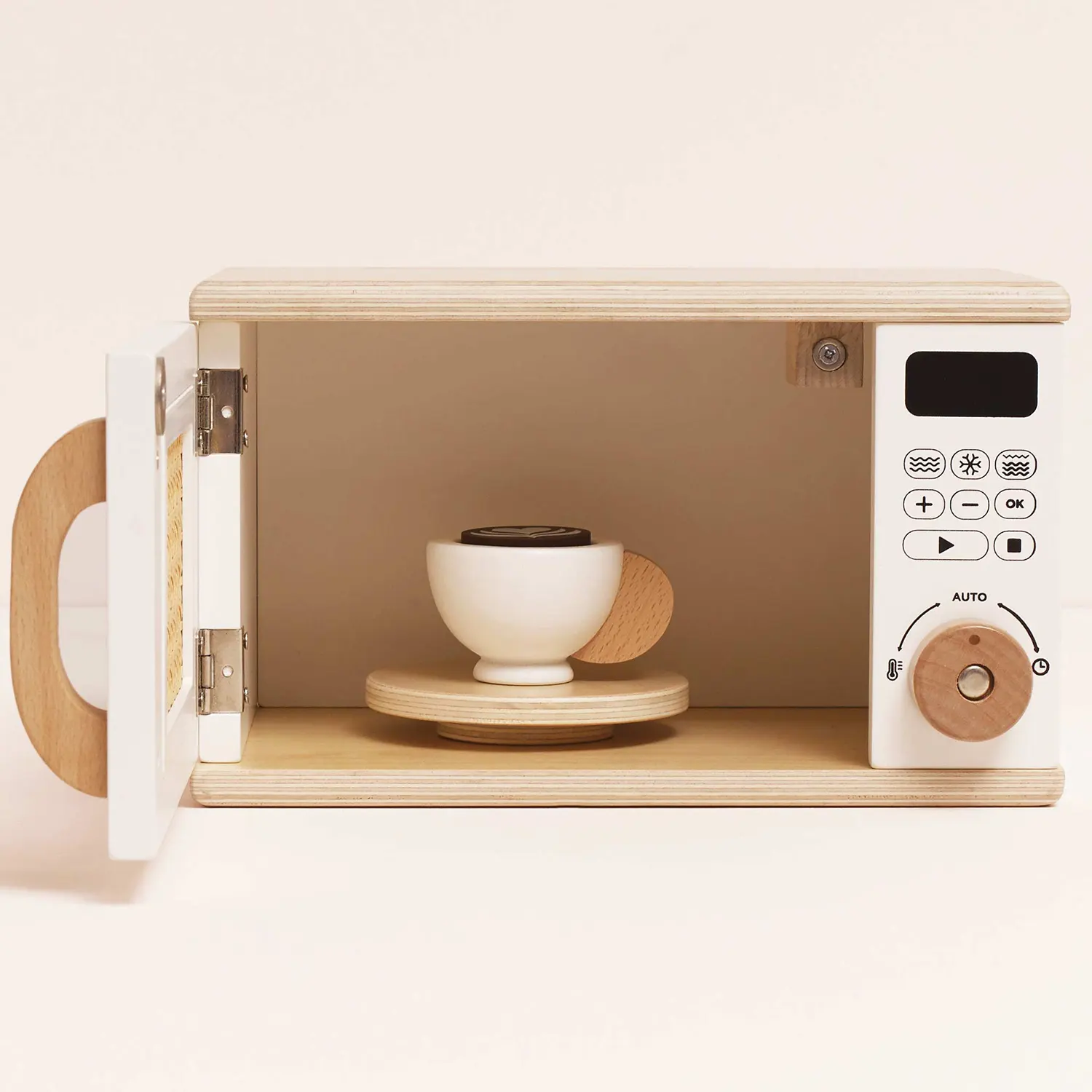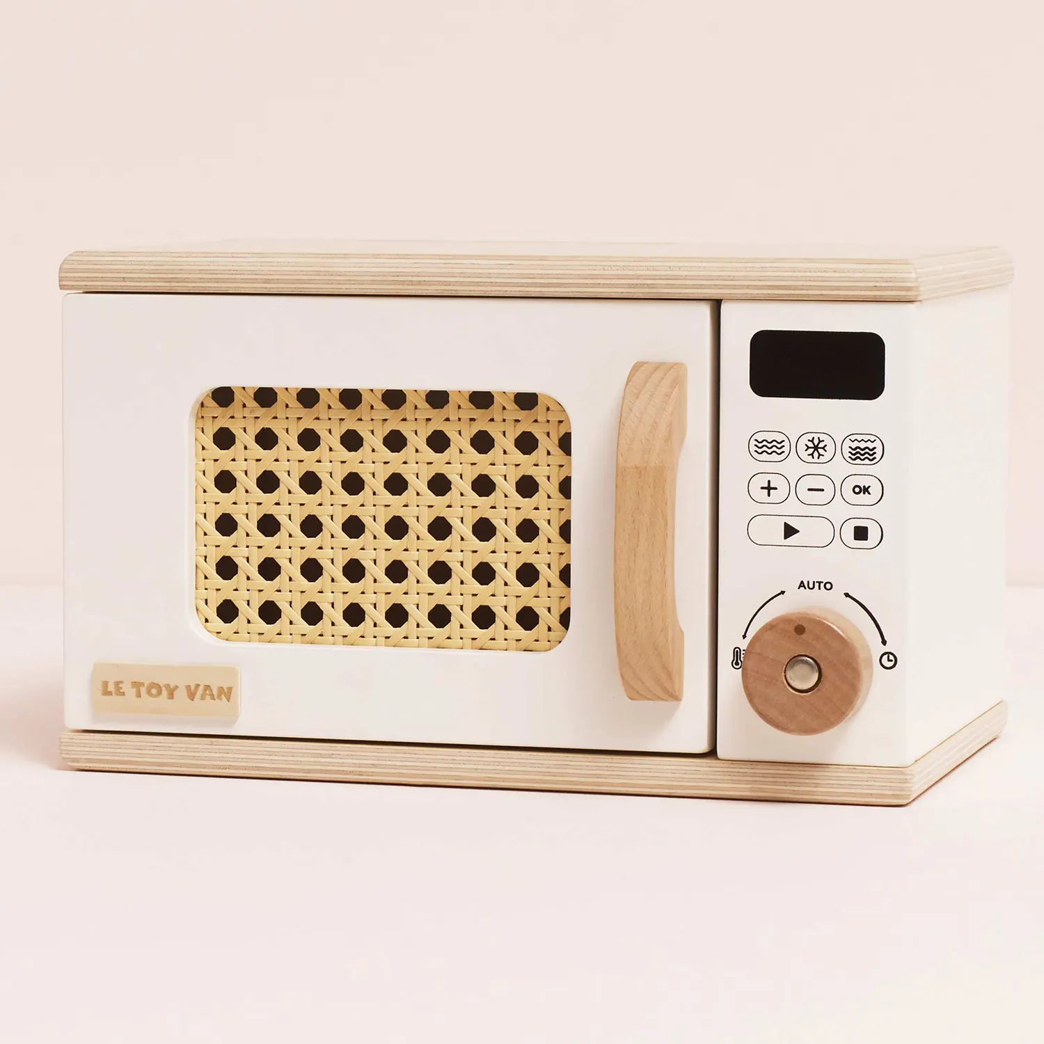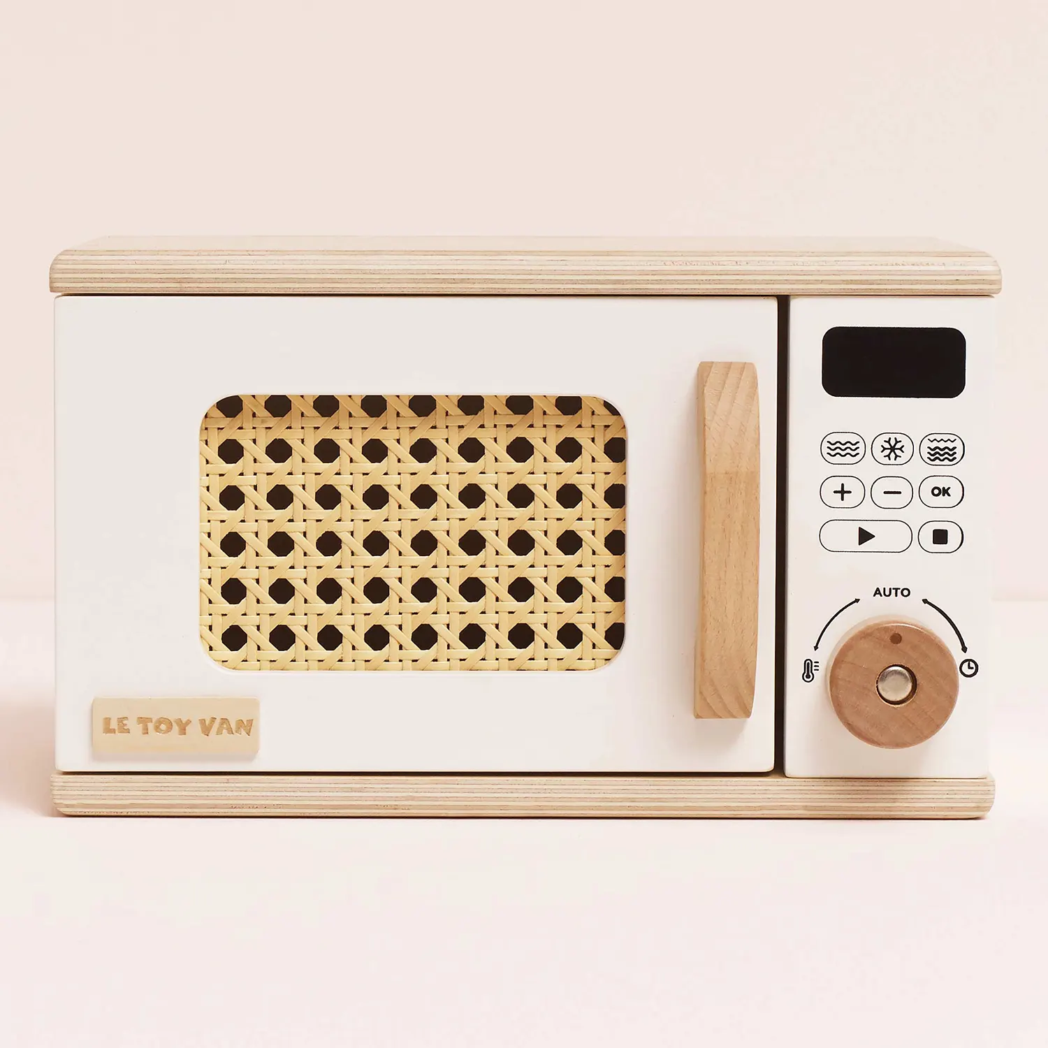 Mit einer charmanten Rattantür, die sich öffnen und schließen lässt, einem detailreichen Bedienfeld und einem drehbaren Teller im Inneren sorgt dieses Spielzeug für realistisches Rollenspiel.