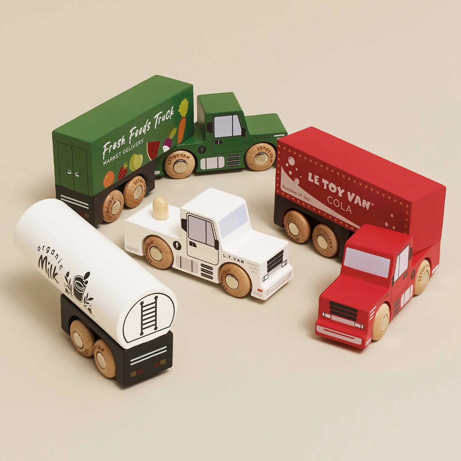 Das Set enthält drei umweltfreundliche Elektro-LKWs, darunter einen Cola-LKW, einen Frischwaren-LKW und einen Bio-Milch-LKW, die jeweils mit einem abnehmbaren Anhänger für interaktiven Spielspaß ausgestattet sind.